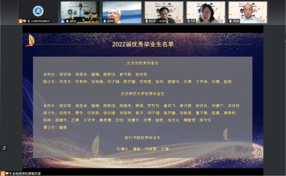 郭雅婷老师宣读了2022届优秀毕业生获奖名单,其中包括北京市优秀毕业生名单、cn影院 优秀毕业生名单和知行书院优秀毕业生名单。