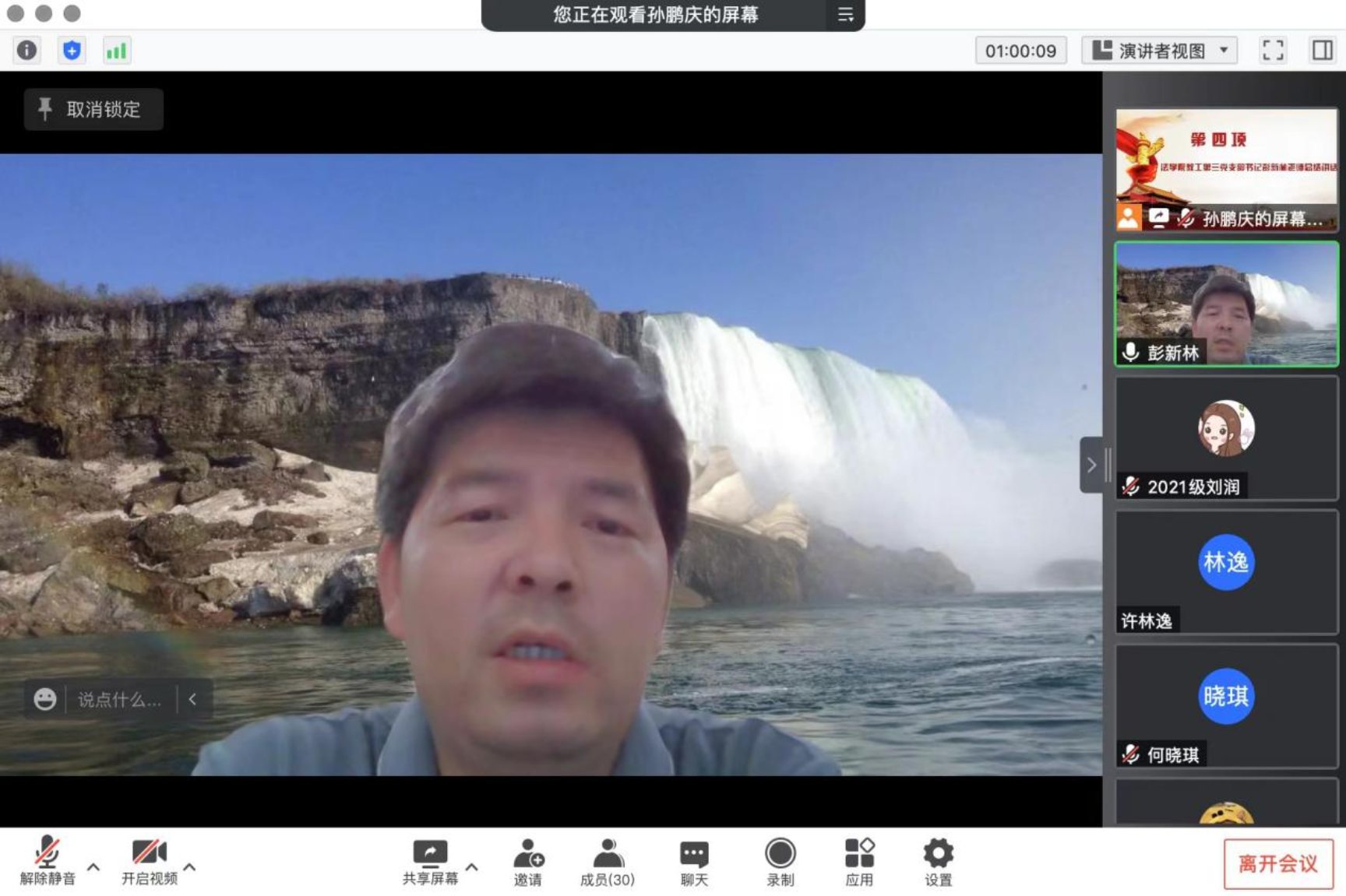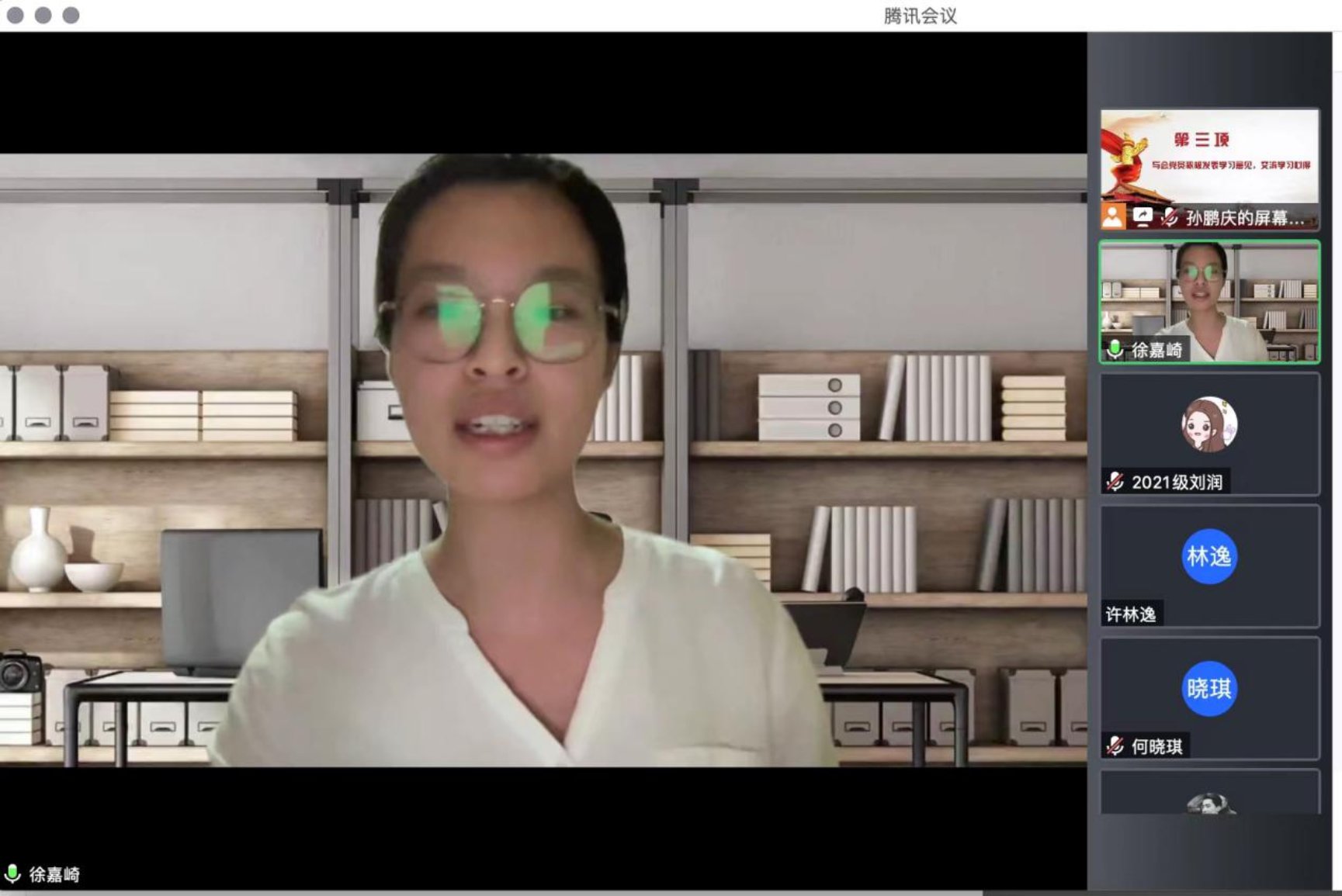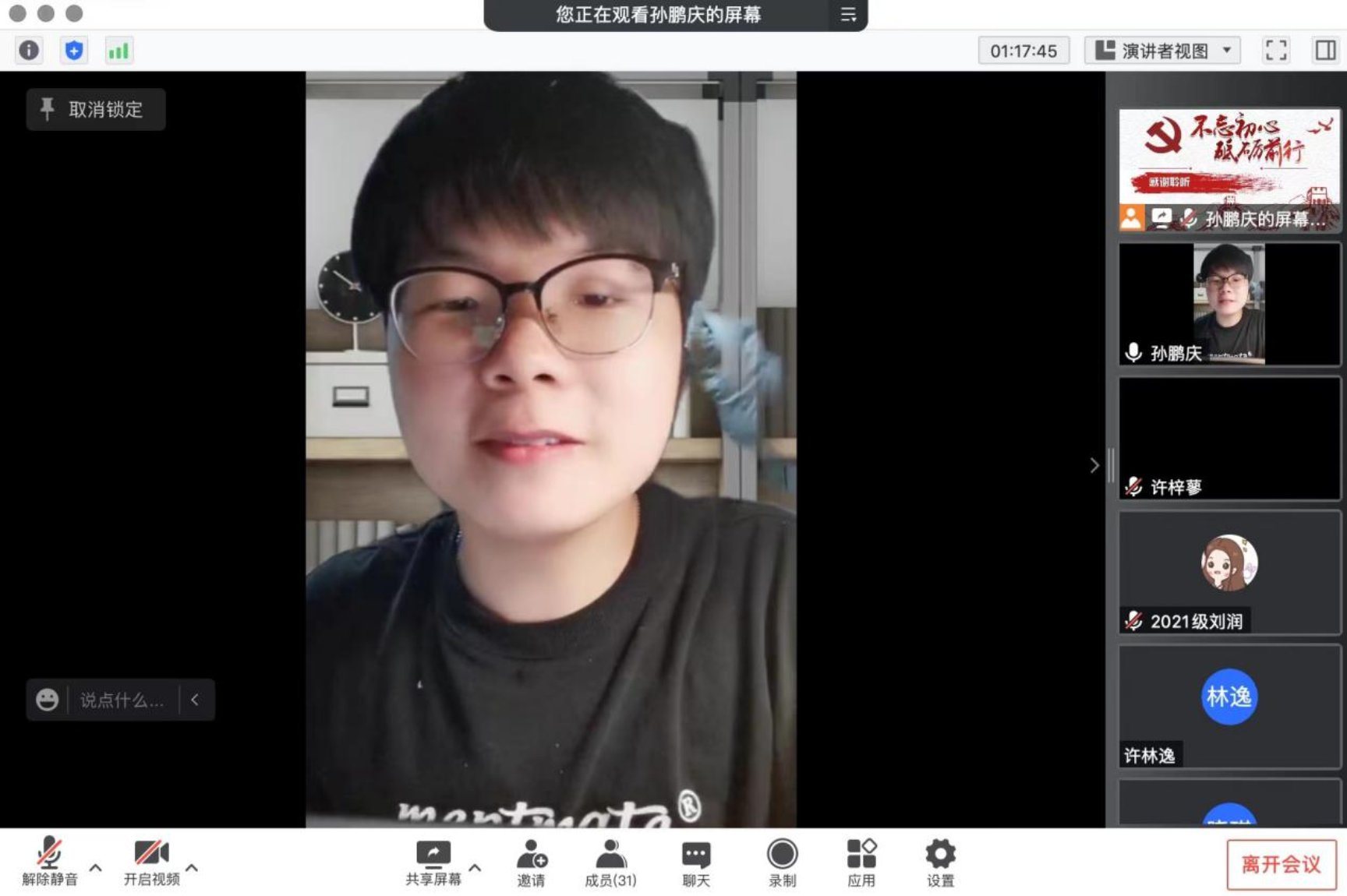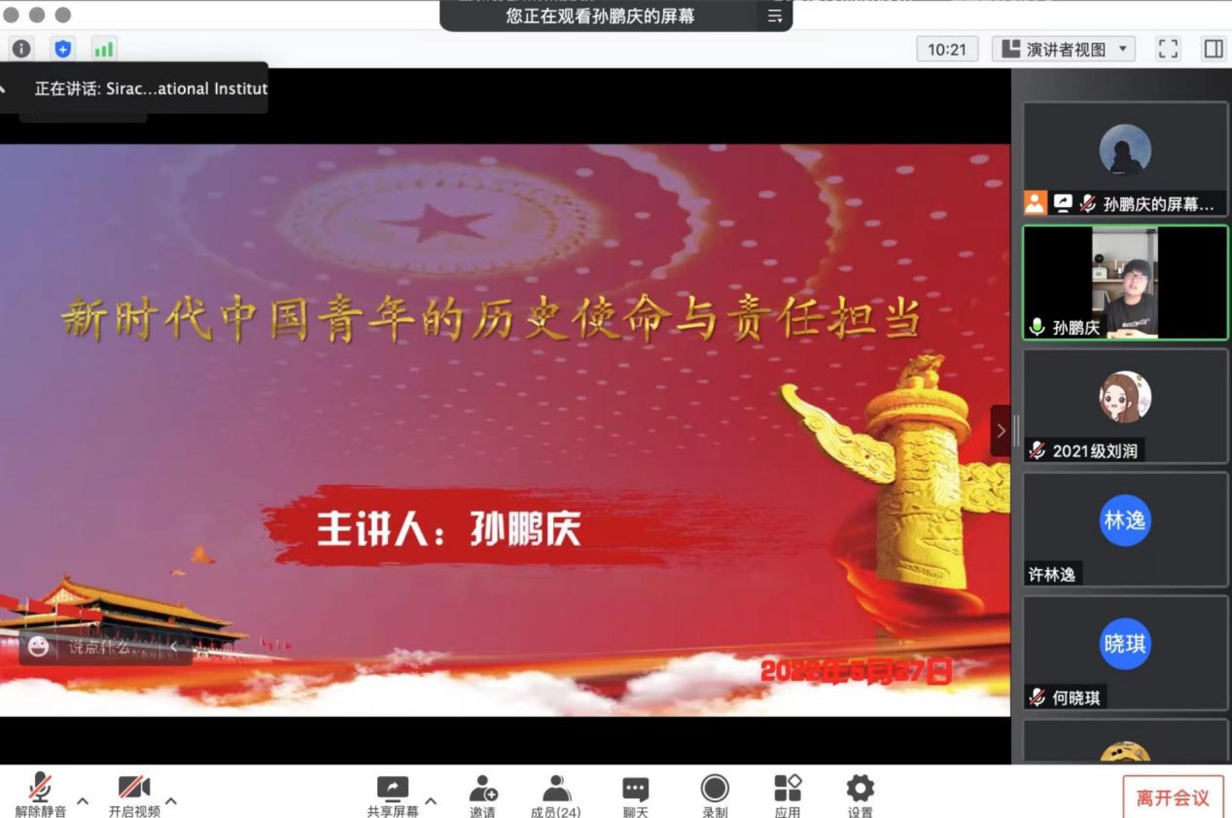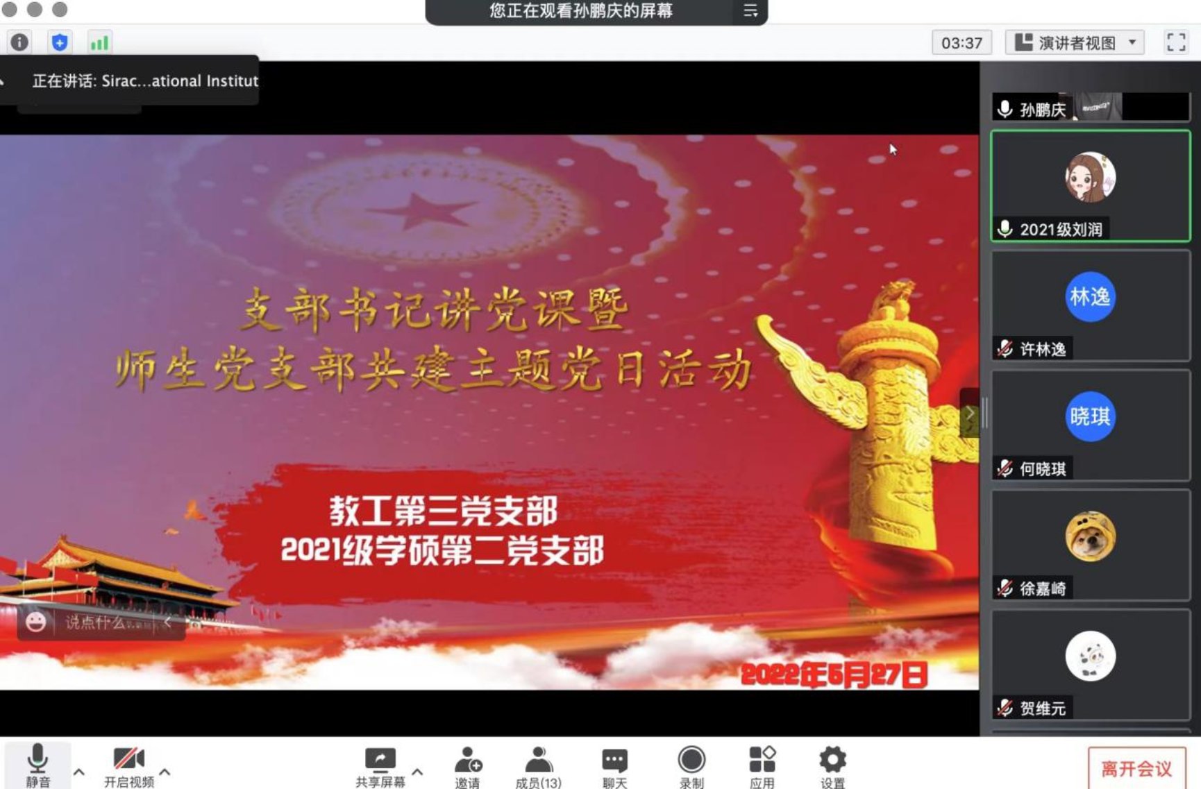 5月27日晚19:00,为进一步深入学习习近平总书记在中国人民大学考察时的重要讲话精神,cn影院 2021级学硕第二党支部联合cn影院 教工第三党支部,以支部书记讲党课和师生党支部共同交流学习为形式,共同开展支部书记讲党课暨师生党支部共建主题党日活动。受疫情影响,本次活动以线上腾讯会议的方式进行。本次会议由2021级学硕第二党支部书记孙鹏庆主持,师生党员共计近40人参加本次会议。