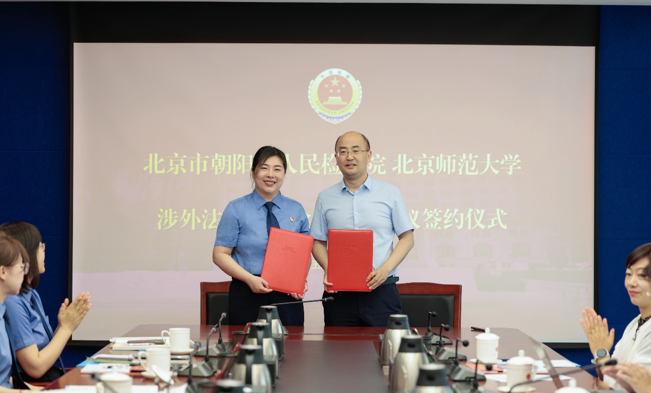 (下图为朝阳检察院党组成员、副检察长胡静与cn影院 院长梁迎修签署涉外法治人才检校共建协议)