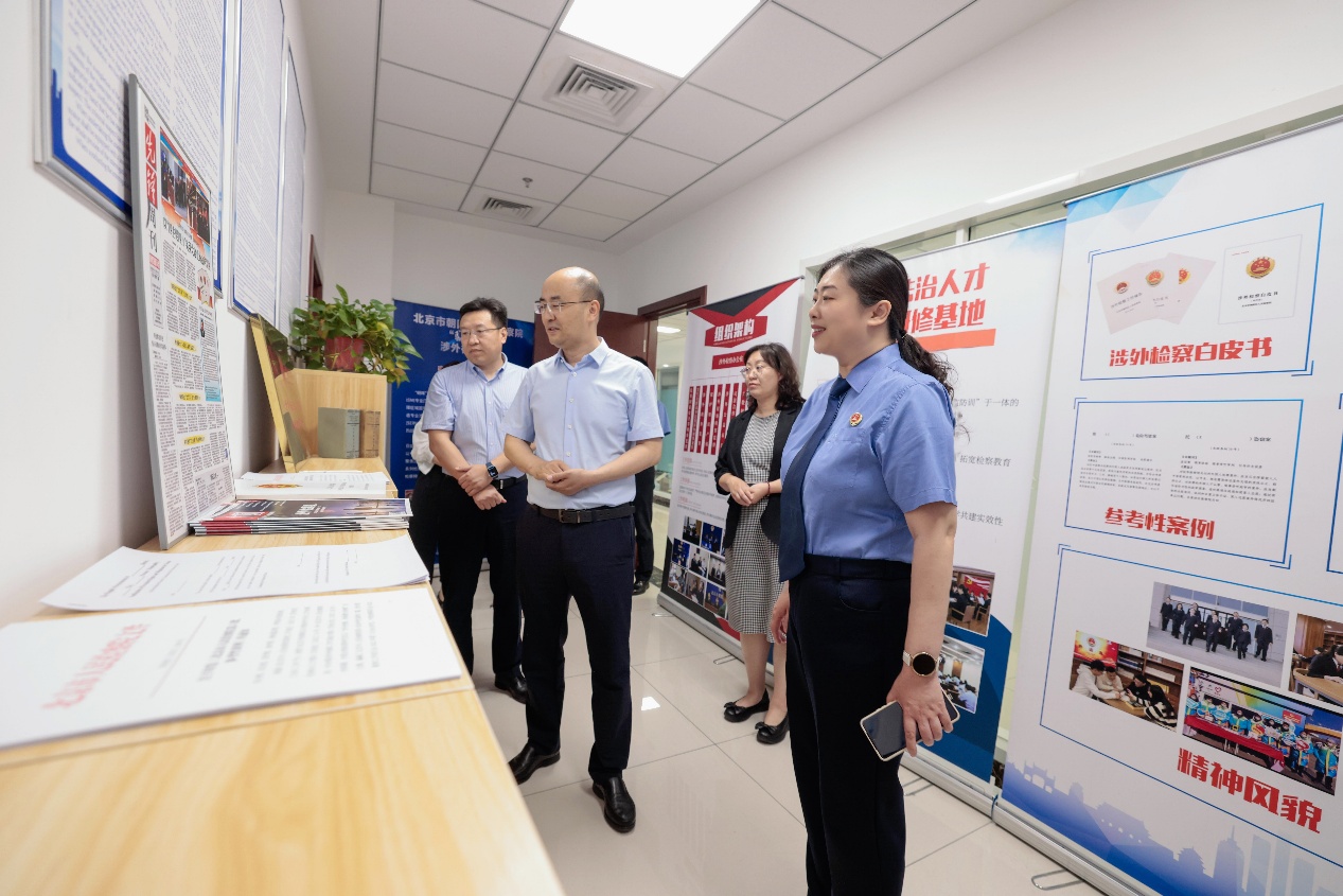 会前,梁迎修院长一行先后参观了朝阳检察院涉外案件远程提讯室、涉外案件听证室、涉外案件远程工作室、律师接待中心、涉外检察办公室、涉外党建活动室等办公场所。