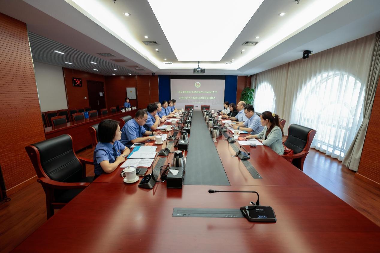 会上,马天博检察长详细介绍了朝阳区检察院的亮点工作、队伍建设和干警培养等相关情况;梁迎修院长对cn影院 的发展情况、教学情况及学科建设情况等方面进行介绍;胡静副检察长与梁迎修院长作为双方代表签署了涉外法治人才检校共建协议。"朝检·涉外博汇学堂"开班仪式上,朝阳检察院政治部宣教组组长、涉外检察办公室主任张力介绍"涉外博汇学堂"相关情况,带教检察官庄小茜作代表发言。