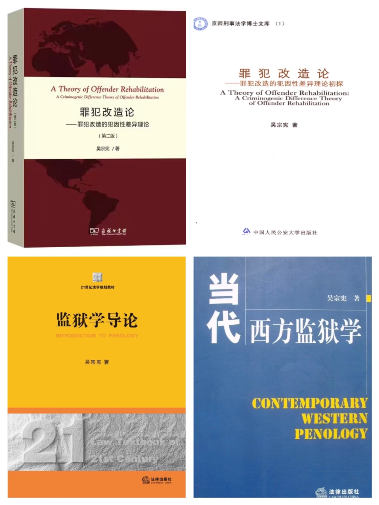 吴宗宪教授的主要研究领域包括犯罪学、监狱学、社区矫正和犯罪心理学,他是我国重要的资深监狱学研究者之一。从1984年在中国政法大学研究生院读二年级时修读“劳改法”(即后来的监狱学)课程、聆听原抚顺战犯管理所所长金源先生和原国民党战犯尚传道先生的讲座、参加大学生演讲团到山东的监狱和劳教所给犯人和劳教人员演讲开始,正式与监狱学结缘,40多年来,在监狱学领域深耕细作,进行了多方面的大量的工作。在研究方面,出版了种类较多的著作。其中,既有专门论述国外监狱学内容的《当代西方监狱学》(法律出版社2025年),也有全面阐述监狱学内容的《监狱学导论》(法律出版社2012年),以及侧重应用性研究的《中国现代化文明监狱研究》(主编,警官教育出版社1996年)和《我国监狱法修订研究》(主编,中国社会出版社2021年);既有系统论述国外罪犯心理矫治的《国外罪犯心理矫治》(中国轻工业出版社2004年),也有论述我国罪犯心理矫治的《中国服刑人员心理矫治》(主编,法律出版社2004年)和《中国服刑人员心理矫治技术》(主编,cn影院 出版社2010年);还有专门论述罪犯改造理论的专著《罪犯改造论——罪犯改造的犯因性差异理论初探》(中国人民公安大学出版社2007年)和《罪犯改造论——罪犯改造的犯因性差异理论》(第二版,商务印书馆2019年)等。这些研究成果较为深入地探讨了监狱领域的相关内容,给学术研究和实务工作提供了很多参考信息和一些思考建议。