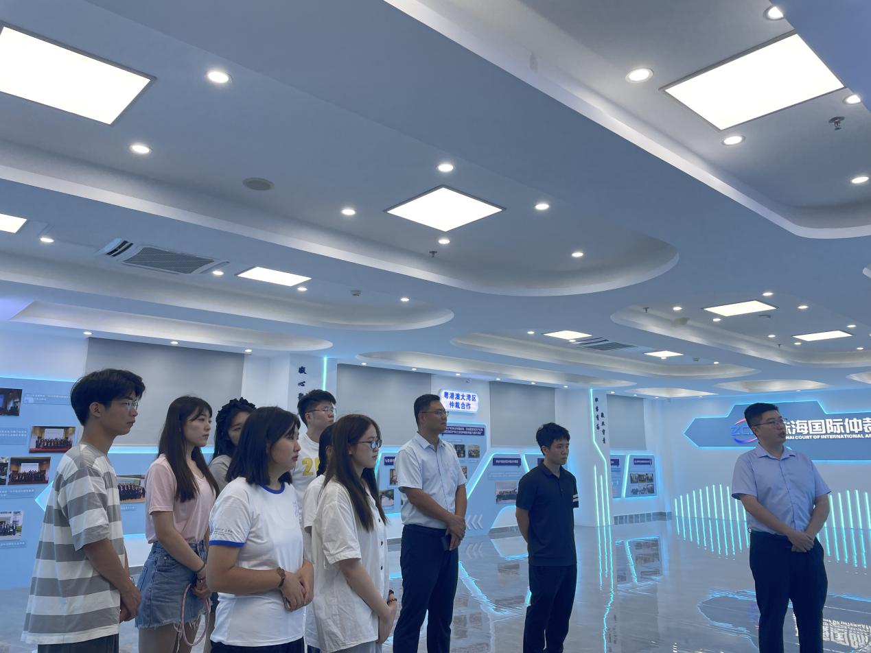 首先,珠海市国际仲裁院的工作人员带领同学们参观了仲裁院展厅、立案大厅和庭审室等。仲裁秘书曾庆加首先向大家详细讲解了仲裁制度的起源和优势,紧接着重点讲解了珠海市国际仲裁院的历史沿革和机制创新。珠海市国际仲裁院在中央两办发文的重视下,依托大湾区优势,以《珠海国际仲裁院条例》为依据,积极创新,取得了丰硕成果。