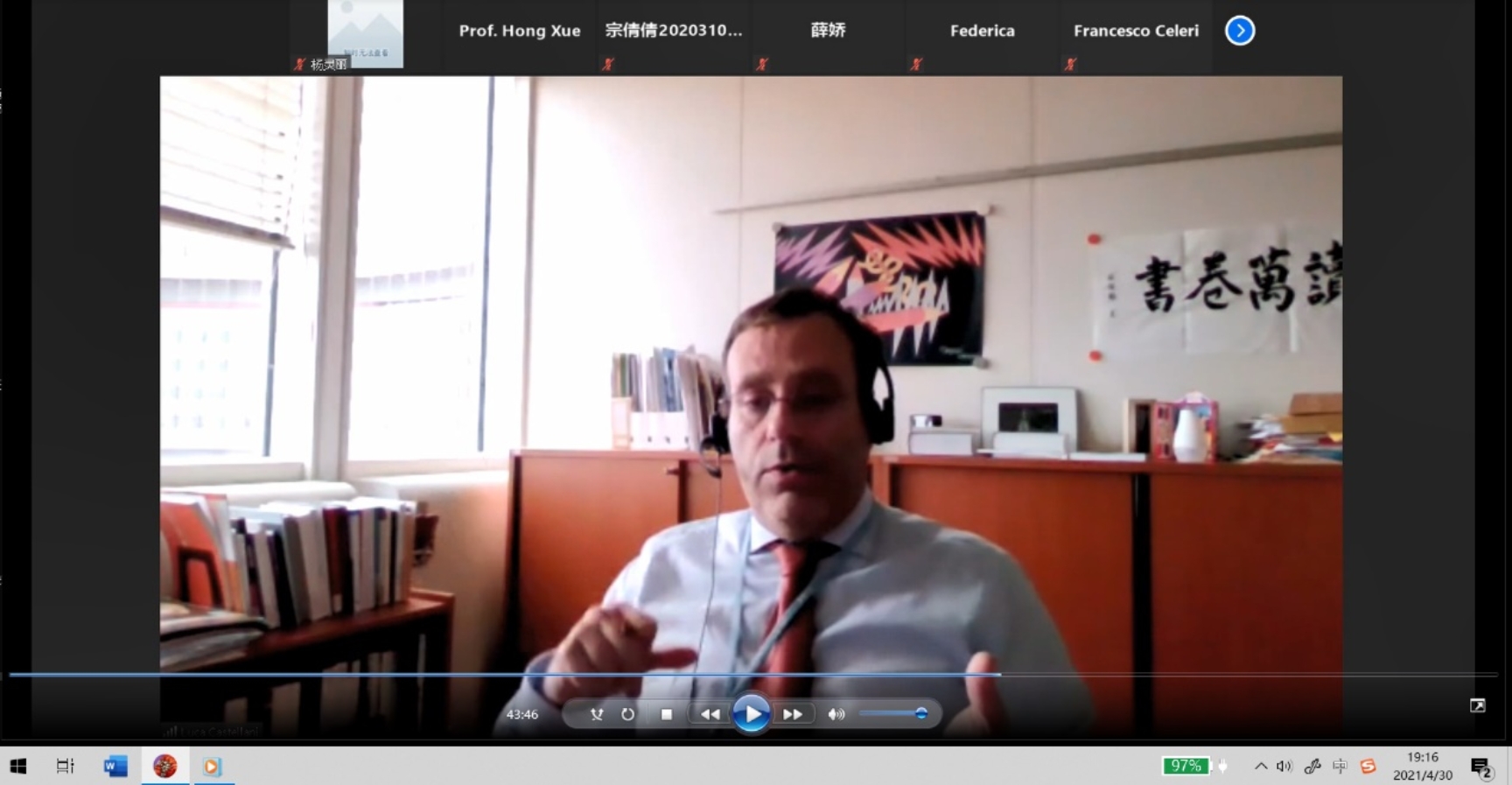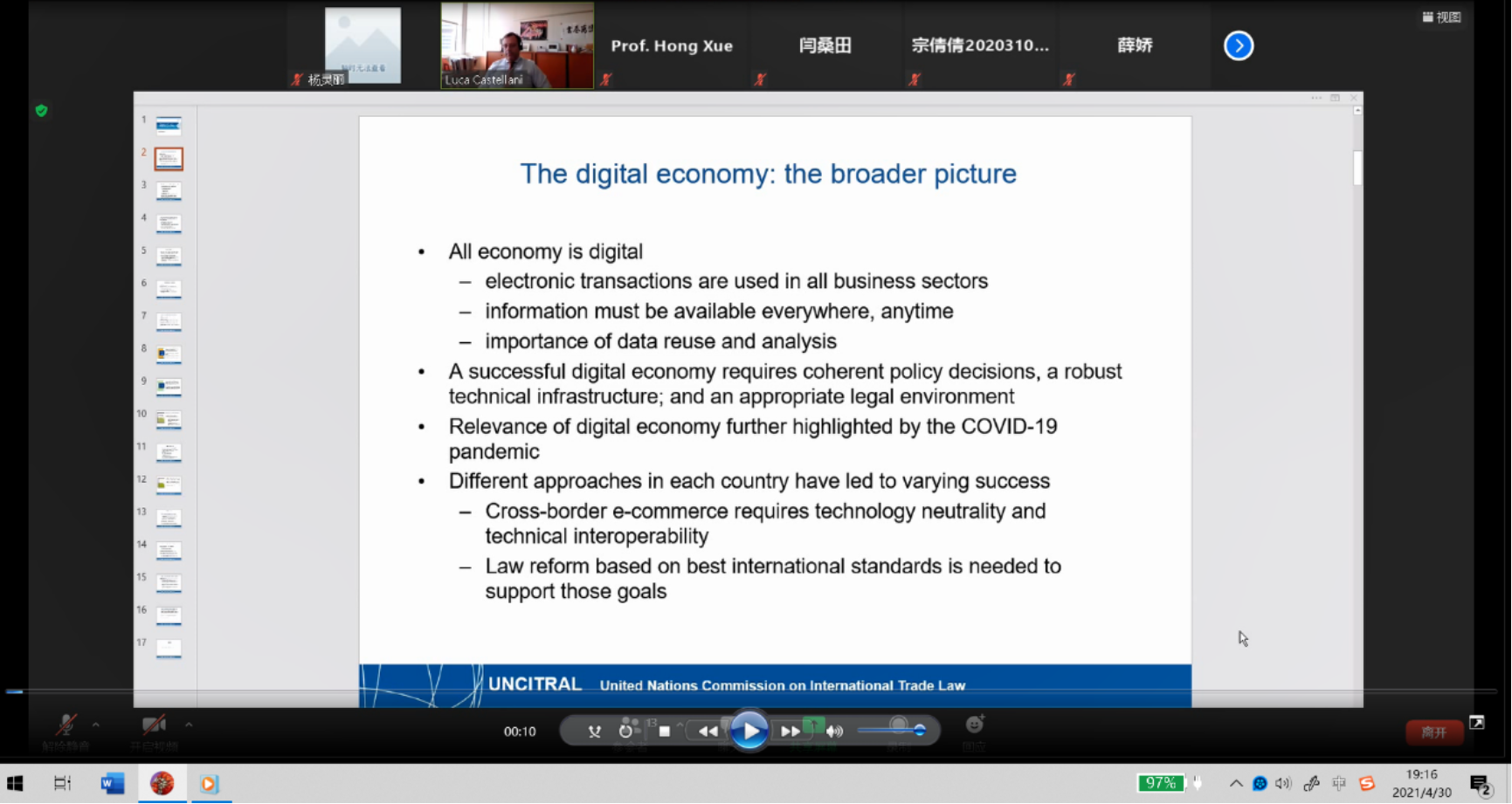 2021年4月30日晚, 联合国国际贸易法委员会秘书处的法律干事Dr. Luca Castellani 为北师大中国、意大利、伊朗等国的中外研究生以及国际经济贸易仲裁员等做了专题网络学术报告。从中国的角度,介绍了贸易法委员会在数字经济法方面的相关工作。