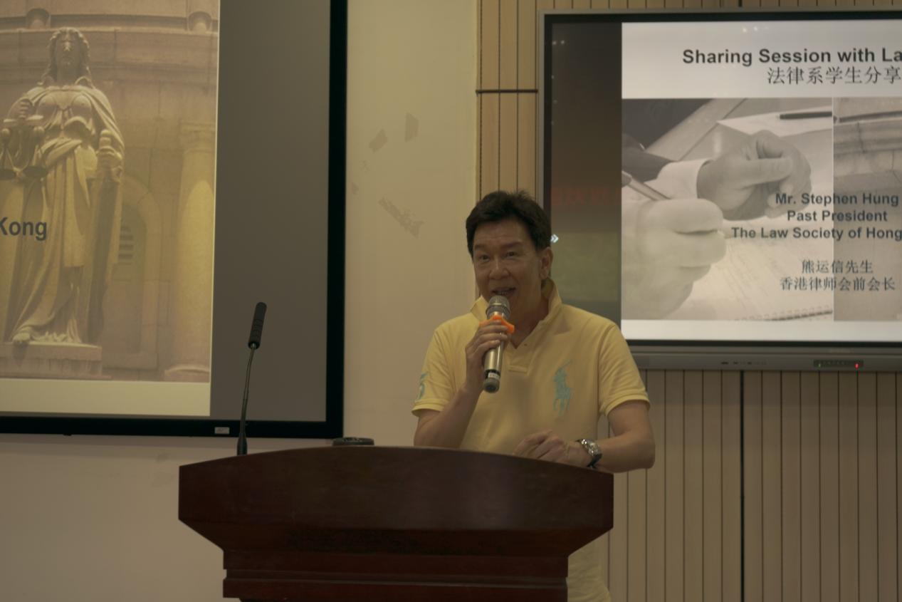 在赵文宗教授简要介绍了熊律师后,熊律师开始了他的分享,熊律师向同学们详细介绍了香港法律界概况、香港律师会的历史和发展、成为香港事务律师的途径以及正式成为香港律师后应承担的职责。他重点指出:香港的事务律师须恪守的道德标准和责任比法律所规定的更为严格,因此同学们在学习法律知识的同时切勿轻视道德品质的培养。